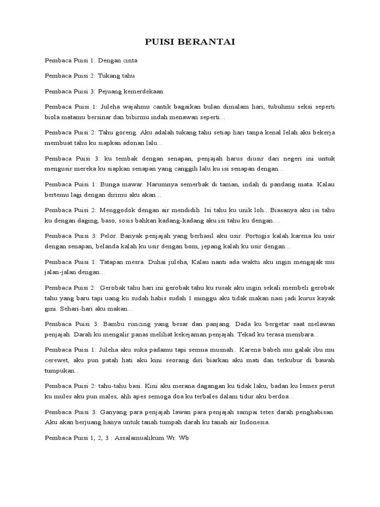 Puisi berantai ini hanyalah puisi tanpa mengandung keseriusan. Juleha, wajahmu cantik bagaikan bulan di malam hari, tubuhmu seksi seperti biola, matamu be… Puisi berantai mempunyai ikatan sajak satu sama lain, namun puisi tersebut diperankan dengan tokoh yang berbeda. Puisi berantai lucu serunya peran dokter cantik youtube. Puisi yang berjudul "di bulan pertamaku" sl :